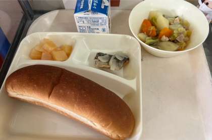 今日の献立は、鯵のレモンマリネ、てぼ豆のスープ煮、白桃(カット缶)、黒糖パン、牛乳です。いただきます。