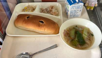 今日の献立は、鶏肉の唐揚げ、ハムと野菜の中華スープ、もやしとコーンの中華和え、レーズンパン、牛乳です。いただきます!