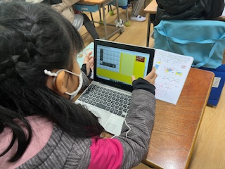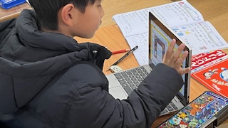 算数ノートをして先生に◯付けをしてもらったら、タブレット端末でプログラミング学習のアプリに取り組んでいました。