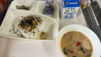 今日の献立は、れんこんのちらし寿司、刻み海苔、雑煮、ごまめ、牛乳です。お正月献立ですね。とっても美味しそうです。いただきます。