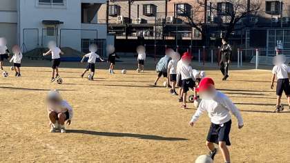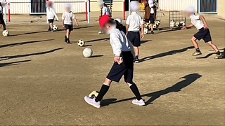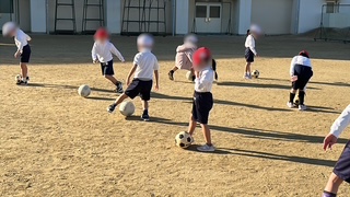 体育のボール運動あそびの様子です。サッカーのようにドリブルしたり、ボールを動かさないように両足で交互にボールに触ったり上手く体を動かす練習をしました。