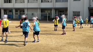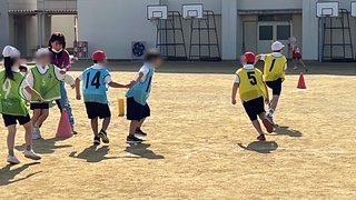 陸上運動のリレーの練習をしていました。チームでバトンパスの練習をした後、実際にトラックを走って練習ゲームをしていました。