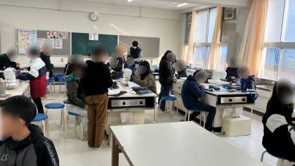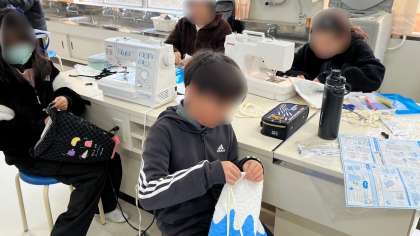 家庭科の裁縫実習です。ナップザックがだいぶ出来上がってきました。完成して使える日が楽しみですね。