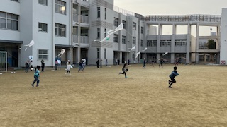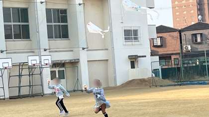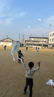 図工の時間に作成した凧を揚げていました。2人一組で協力して活動していました。青空に揚がった凧に子どもたちは大喜びでした。