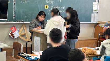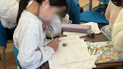 算数の学習です。小数の掛け算の練習問題プリントに取り組んでいました。できたら先生にチェックしてもらっていました。
