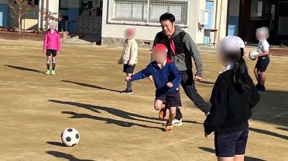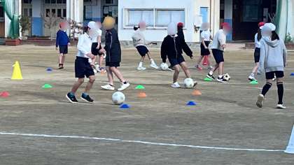 体育でボール運動の学習です。サッカーみたいにドリブルしながらミニコーンを回ったり、先生にボールを奪われないようボールをキープしたりする練習をしていました。