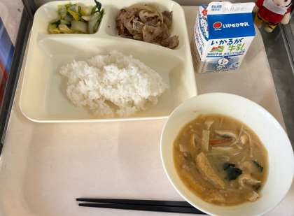 今日の献立は、豚肉の胡麻だれ焼き、味噌汁、菊菜と白菜のおひたし、ご飯、牛乳です。いただきます。