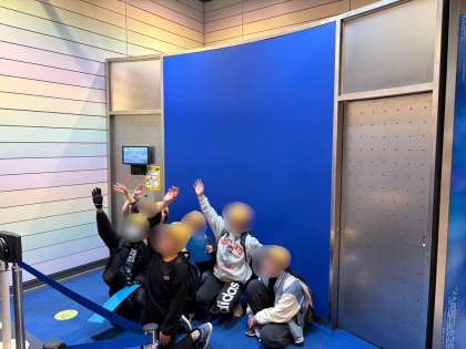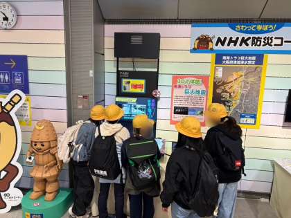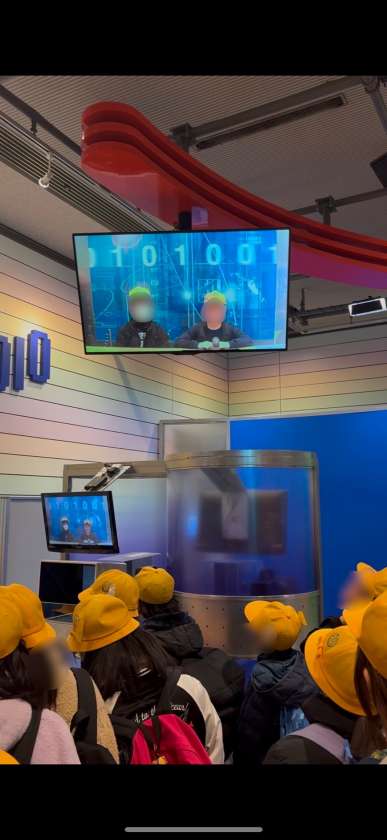 BKホールでの活動の様子です。放送に関する展示を見学したり背景が入れられるブルーバックの前で撮影した画像をモニターで見たり楽しんで学習していました。