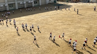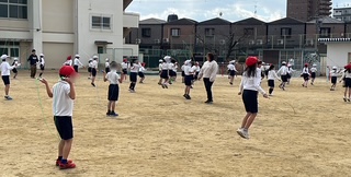 合同体育の様子です。5分間の持久走や縄跳びなどでしっかり運動しました。