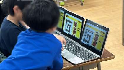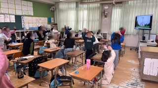 上段は1組、タブレット端末でプログラミングの学習をしていました。中段は2組、音楽の学習で汽車の歌に合わせてのじゃんけん列車あそびの説明を係がしており、これから楽しむようです。下段は3組、ここも音楽の学習で、モニターの動画に合わせてたのしそ楽しそうにダンスをしていました。