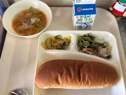 今日の献立は、豚肉のオイスターソース焼き、中華スープ、ツナと青梗菜の炒め物、黒糖パン、牛乳です。いただきます。