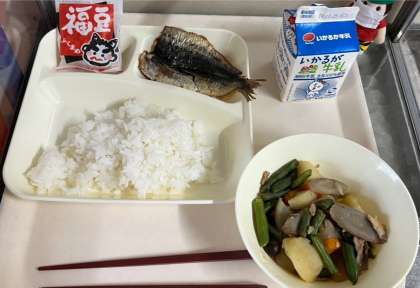 今日の献立は、イワシの生姜醤油かけ、含め煮、炒り大豆、ご飯、牛乳です。
