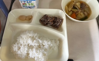今日の献立は、鯨の竜田揚げ、豚肉とじゃがいもの煮物、白花豆の煮物、ご飯、牛乳でした。とても美味しかったです、ごちそうさまでした。