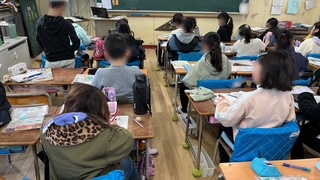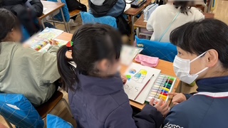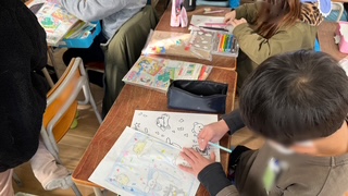 図工の学習で「釘打ちビー玉ゲーム」を制作していました。ゲームの土台板のデザインに取り組んでいました。もう着色している子もいれば、デザイン画を考えている子もいました。