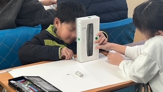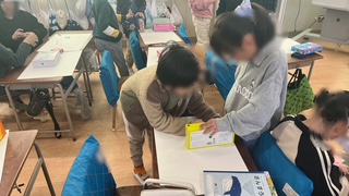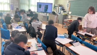 算数の学習です。図形の学習で、身近なものの形について調べていました。家から持ってきた物の形を画用紙に写しとって調べていくようです。