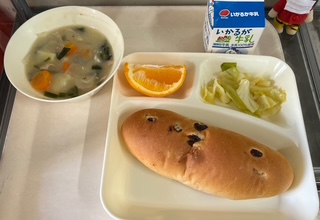 今日の献立は、鶏肉とほうれん草のシチュー、キャベツのサラダ、デコポン、レーズンパン、牛乳です。寒い日に温かいシチューは嬉しいですね、いただきます。