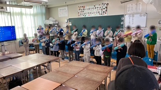 生活科で調べた自分のことについての発表でした。生まれた頃の様子や今までの生い立ち、現在の身長や体重などをまとめて発表しました。また、合奏も披露しました。上段が1組、中段が2組、下段が3組です。