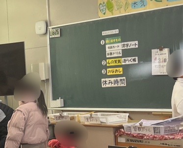 登校したら一日の準備をします。黒板には、今日の朝にすることが掲示しています。