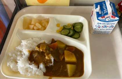 今日の献立は、チキンレバーカレーライス、きゅうりとコーンのサラダ、洋なし(カット缶)、牛乳でした。とても美味しかったです。ごちそうさまでした。