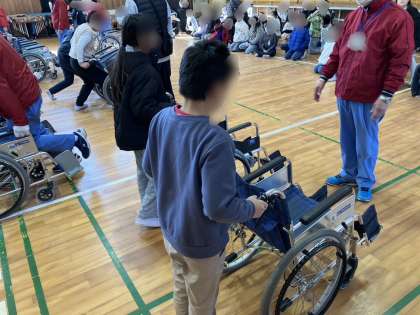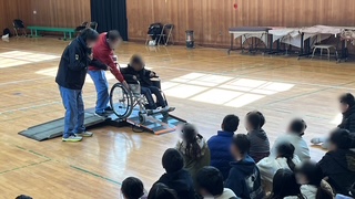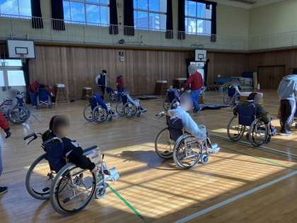 4年生が車椅子体験の出前授業を受けました。前半は体育館で車椅子を自分で操作して動く体験でした。