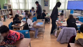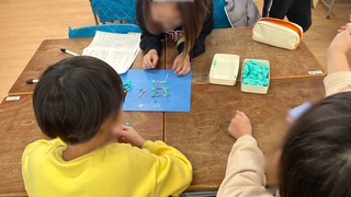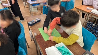 算数の学習です。図形の学習です。箱の特徴を学習するのに竹ひごと粘土で長方形の箱と正方形の箱とを作りました。班で協力するところと隣同士のペアで協力するところとに分かれて作りました。実際に作ることで、辺や頂点の数、長さなどの特徴に気づいていきます。