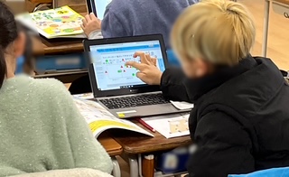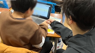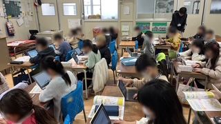 雨天で体育ができない(今、体育館も卒業式仕様になっているので体育ができません)ので、教室での学習です。ラインサッカーの作戦を考えていました。タブレット端末のアプリを使って駒やボールなどを動かして練っていました。この後、チームで集まって話し合って決めるようです。