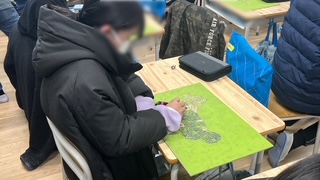 図工の学習で版画作成の途中です。 細かいところを彫るのに力を入れ過ぎないようにすることや彫る先に手を置かないことなどに気を配って彫り進めていました。