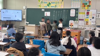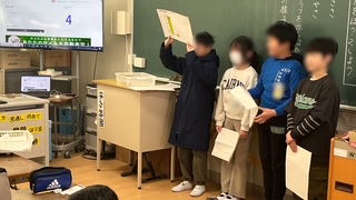 国語の学習で調べたことを発表する活動です。班で協力して、学級内でアンケートを取ったり聞き取りをしたりして調べたことを資料も作って発表しました。
