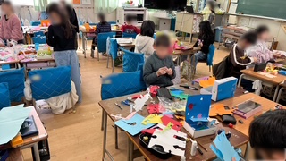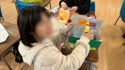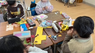 図工の学習です。「不思議な宝箱」という題名で、図形の学習で使った箱を色紙を使ったりマジックペンで着色したりしてデザインしていきました。みんなとても個性的な箱を作っていました。「ここ、こうして動くねん!」って仕掛けを説明してくれました。