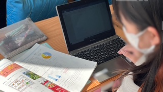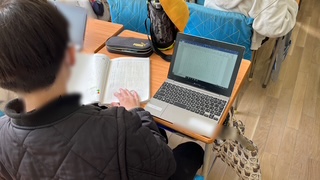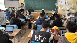 国語の学習です。資料を見て自分の意見をまとめて発表する活動でした。タブレット端末で発表原稿を作っていました。