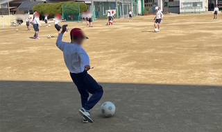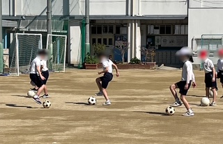 体育の学習です。サッカーボールを使ったボール運動あそびです。一人でボールを上手く扱う動きをしたり二人でパスし合ったりしていました。