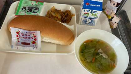 今日の献立は、じゃがいものミートグラタン、レタスのスープ、ソフト黒豆、コッペパン、イチゴジャム、牛乳です。いただきます。