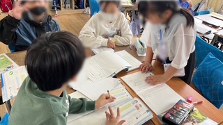 国語の学習です。教科書に載っている友だち二人の話し合いの様子から、二人のやりとりの中で話し合いとして良いところを考え、班で話し合っていました。班でまとめた意見を発表し、みんなで考えていました。