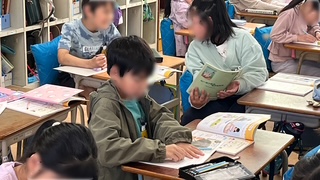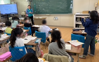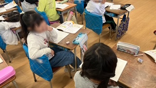 算数の学習です。2年生で学習した掛け算について、いろいろな法則があることを考えていきます。友だちと意見交換して深めた考えを発表していました。