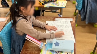 鉛筆での運筆練習をしていました。練習プリントに名前を書いて(机に名前が貼ってあるので、それを名前欄に写していました。)から、直線や曲線などいろいろな動きの練習をしていました。