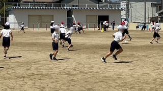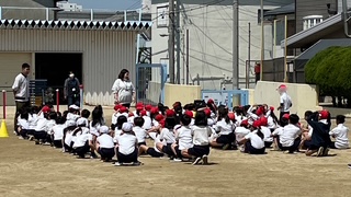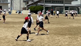 合同体育で鬼ごっこをしていました。運動場をいっぱい使って走り回っていました。