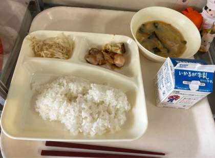 今日の献立は、焼き鳥、味噌汁、もやしの柚子の香和え、ご飯、牛乳でした。ごちそうさまでした。