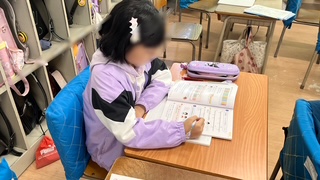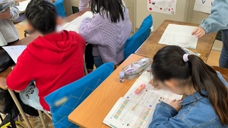 算数の学習です。大きな数の練習問題に取り組んでいました。できたら先生に◯つけをしてもらいます。