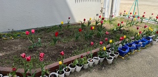 体育館前の花壇にチューリップが咲いています。2年生が昨年度から育てていました。とても綺麗ですね。