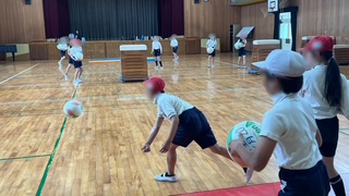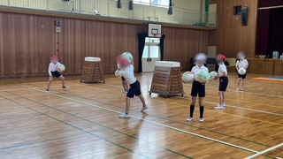 体育の学習でドッジボールと雪合戦をミックスしたゲームを楽しんでいました。