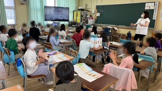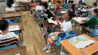 音楽の学習です。曲のリズムにあわせて手拍子したり足踏みしたりしていました。後半は立って、体全体でリズムを楽しみました。
