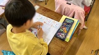 国語の学習です。ひらがなの練習に入っています。今日は「と」や「り」を練習しました。書く姿勢もとてもいいですね。