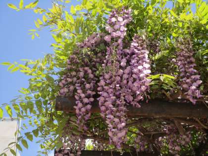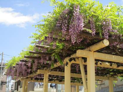 きれいなフジの花が咲いています。管理作業員さんに剪定をしていただいたおかげで、きれいに咲きました。校内のどこにあるかわかりますか?探してみてくださいね。
