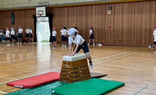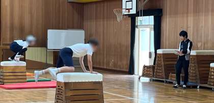 体育の学習で跳び箱運動をしていました。先生が開脚跳びのフォームをしっかりチェックしてアドバイスを送ります。