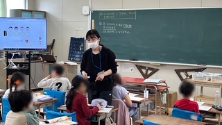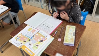 算数の学習です。12個のお菓子を4人に分ける問題で、プリントに図示して分けていくことで視覚的に割り算を捉えられるようにして進めていました。
