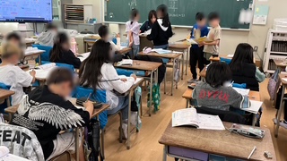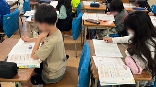 算数の学習です。あまりのある割り算の筆算の練習問題に取り組んでいました。できたら先生にチェックしてもらっていました。