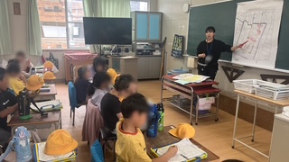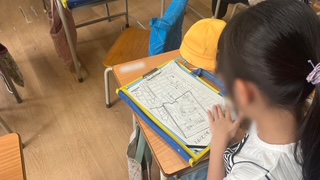 学校に帰ってから、発見したことを校区地図に書き込んでいきました。習った地図記号を使って、自分たちで作った校区地図ができあがりました。