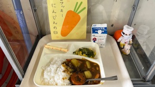 今日の献立は、牛肉と大豆のカレーライス、レタスとコーンのサラダ、棒チーズ、牛乳です。今日のカレーにもラッキーにんじんが入っているようですね。いただきます。
