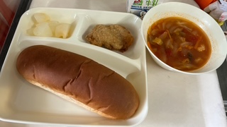 今日の献立は、とんかつ、ミネストローネ、和梨(カット缶)、黒糖パン、牛乳です。いただきます。