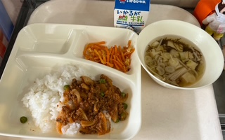 今日の献立は、タコライス、豆腐ともずくのとろり汁、にんじんしりしり風、牛乳です。いただきます。